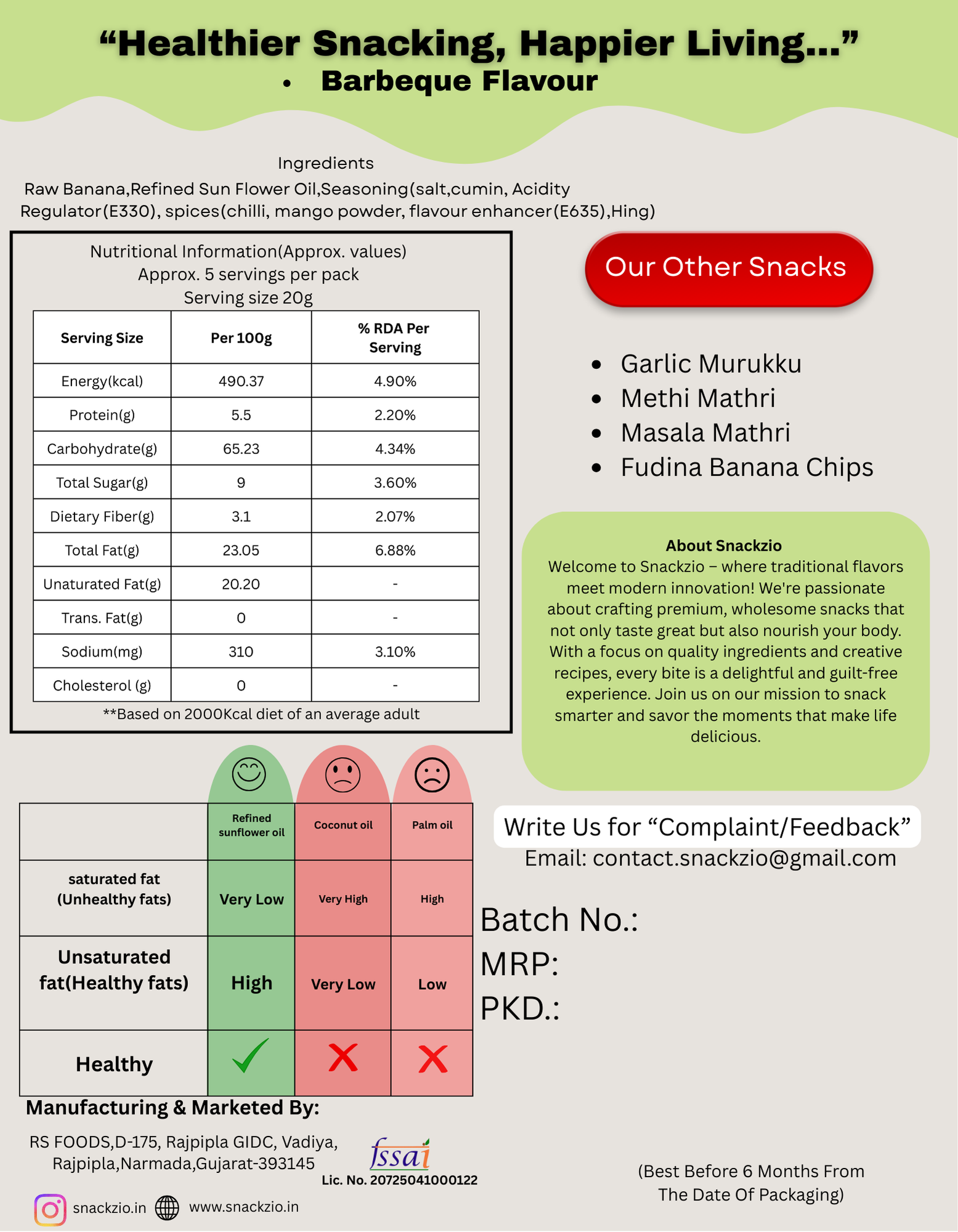 Snackzio Barbeque Banana Chips bring a smoky, tangy, and slightly sweet flavor to your snacking experience. Made from carefully selected bananas, these chips are seasoned with a rich barbeque spice mix that delivers the perfect balance of crunch and bold taste in every bite. Fried in refined sunflower oil, they are light, crispy, and full of natural goodness. With no palm oil, zero trans fat, and cholesterol free, they make a healthier alternative to regular fried snacks. Snackzio Barbeque Banana Chips are the perfect companion for tea-time, parties, or anytime cravings—delivering flavor, crunch, and health together.