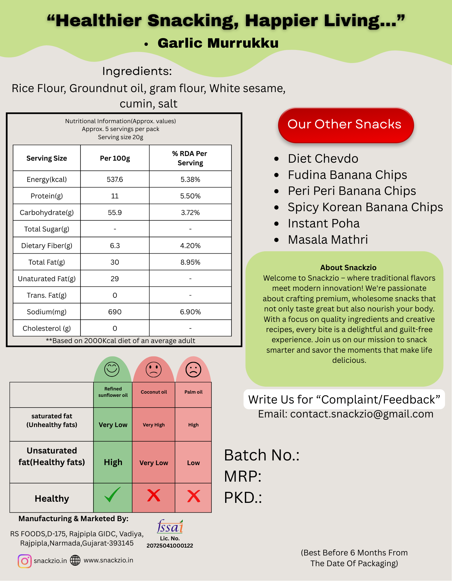 Garlic Murukku is a crisp, savory South Indian snack crafted from traditional ingredients and fried in pure groundnut oil for a rich, aromatic crunch. Infused with the bold flavor of garlic and mild spices, it delivers a perfectly balanced taste that makes it an irresistible tea-time and anytime snack.
