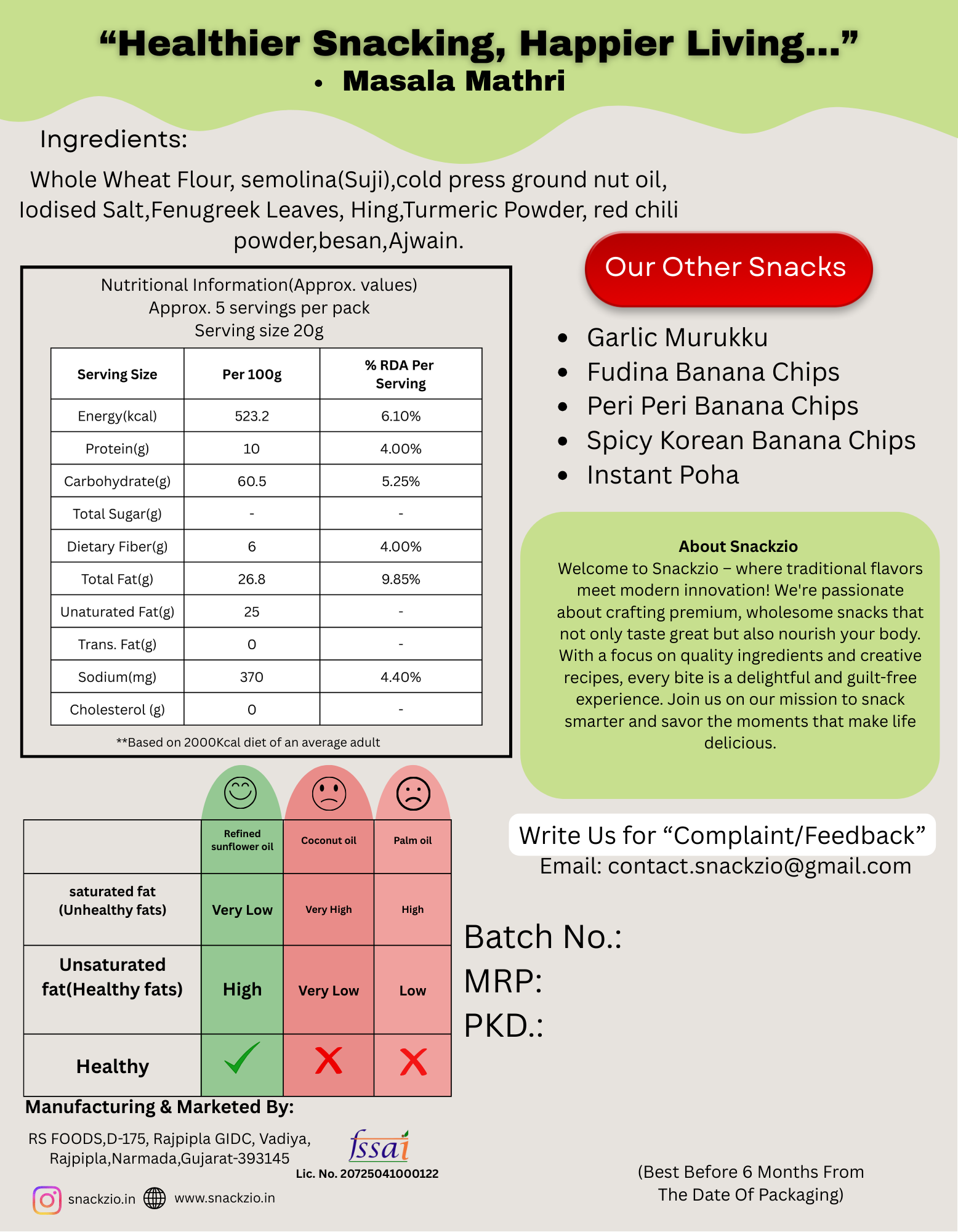 Snackzio Masala Mathri is a crispy, savory snack made from wholesome wheat and cooked in groundnut oil for a rich, authentic taste. Flavored with aromatic Indian spices, it delivers the perfect balance of crunch and masala in every bite—ideal for tea-time snacking or anytime munching.
