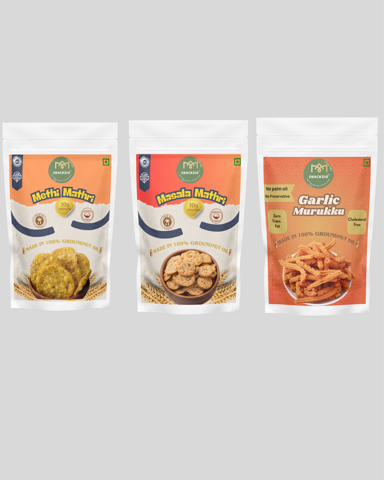 Enjoy a month-long supply of authentic Indian snacks with Snackzio’s special Monthly Combo Pack. It includes 1kg Methi Mathri, 1kg Masala Mathri, and 1kg Garlic Murukku – all made with premium ingredients, cold-pressed groundnut oil, and zero preservatives. Each pack is trans fat free, cholesterol free, and maida free, offering a wholesome and flavorful snacking experience. Perfect for families, tea-time, or festive gatherings – this combo ensures your snack jars stay full all month!